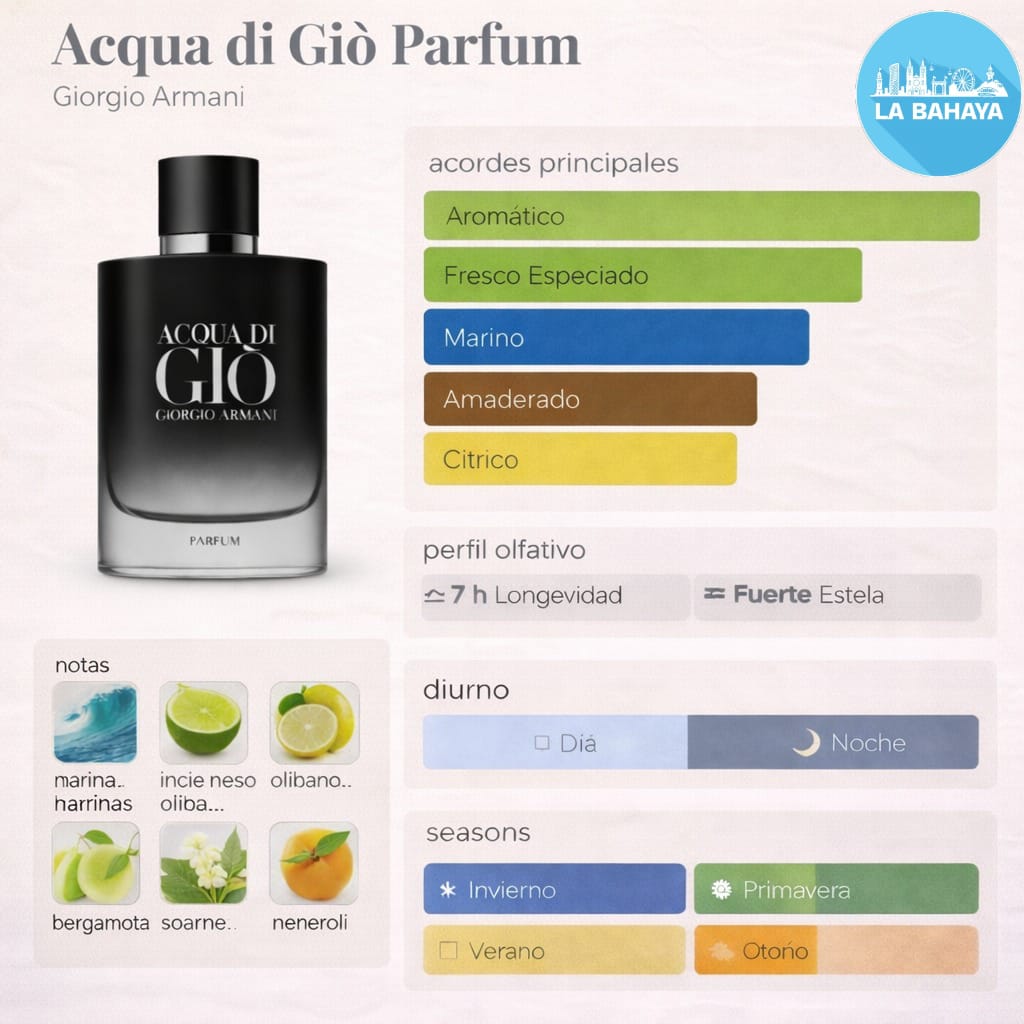 Acqua di Giò Profumo es una fragancia masculina intensa, elegante y sofisticada. Combina la frescura marina clásica con un fondo oscuro, ahumado y mineral, creando un aroma maduro, poderoso y muy refinado. Ideal para hombres seguros, con presencia y gusto por perfumes elegantes.