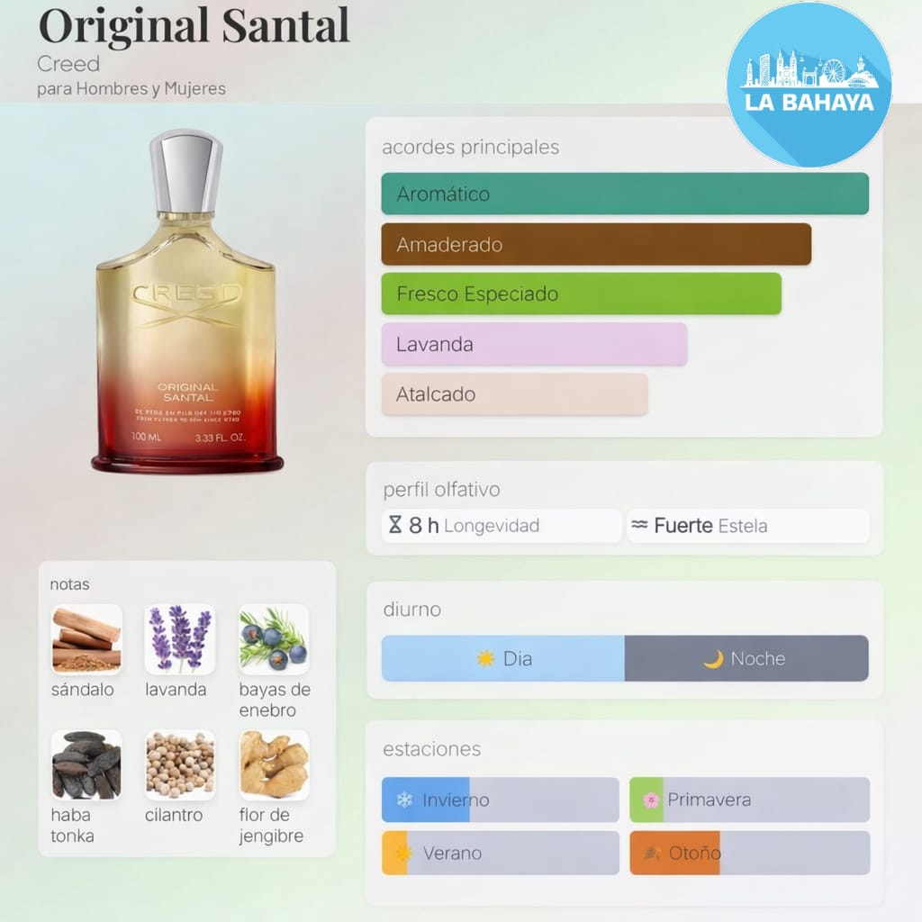 Creed – Original Santal es una fragancia unisex, cálida y sofisticada, inspirada en la sensualidad oriental con un giro moderno y elegante. Combina especias cremosas y maderas suaves para un aroma envolvente, limpio y muy refinado, ideal para quienes buscan distinción sin excesos. Proyecta seguridad y lujo discreto, con excelente duración.
