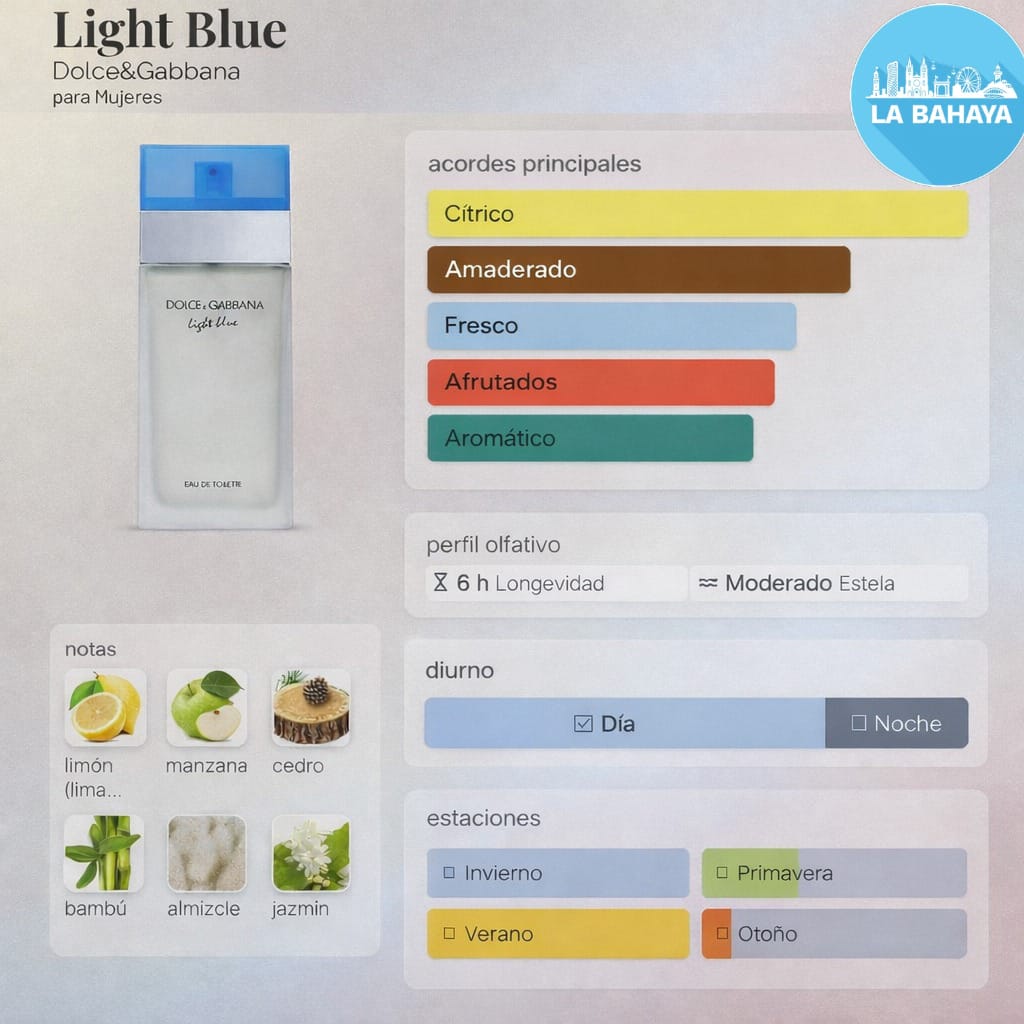 Light Blue es un perfume refrescante, luminoso y muy natural, inspirado en el verano italiano. Transmite sensación de limpieza, frescura y energía, perfecto para mujeres que aman aromas ligeros, elegantes y fáciles de usar.