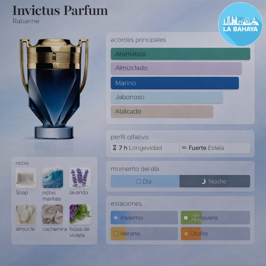 Invictus Parfum es una fragancia masculina poderosa, elegante y sofisticada, más refinada y profunda que las versiones anteriores de Invictus. Mantiene el ADN fresco-amaderado, pero con un toque más oscuro, limpio y lujoso, ideal para el hombre seguro, moderno y ganador.