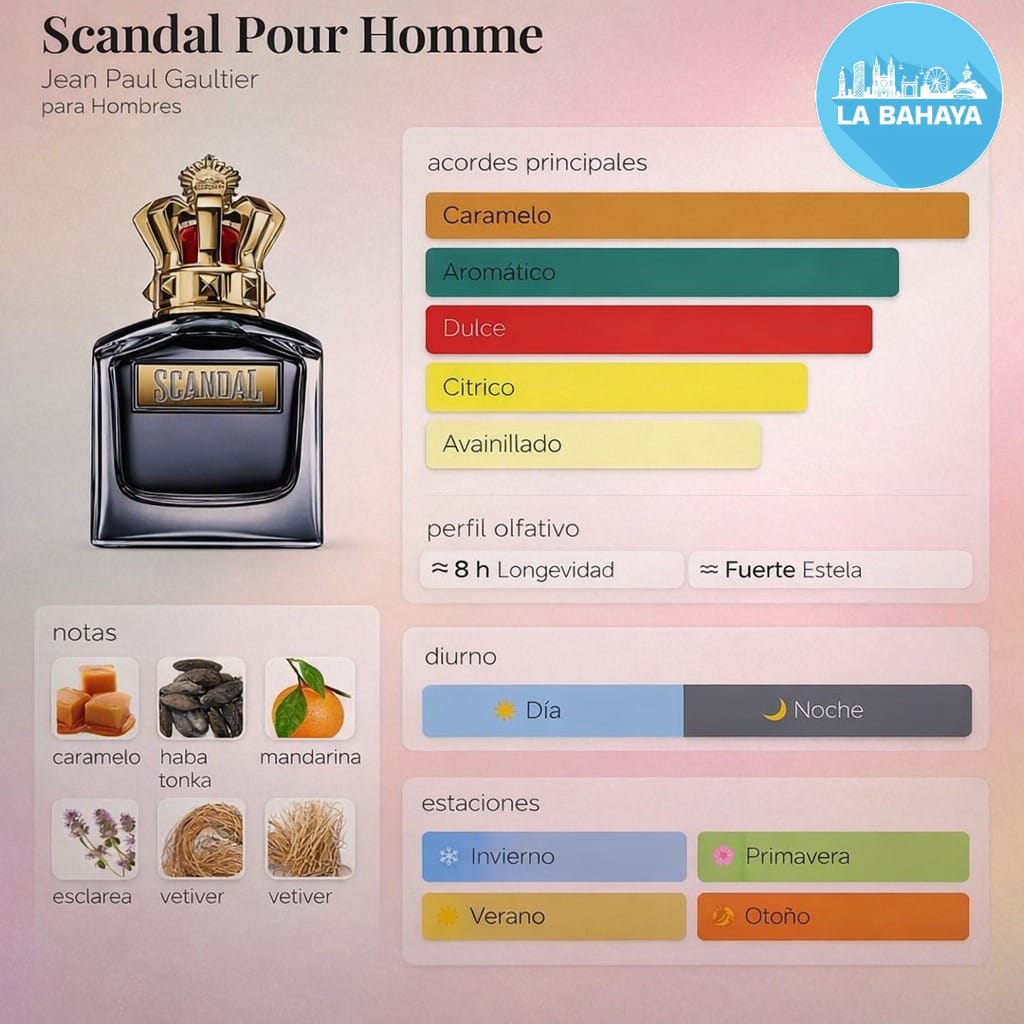 Scandal Eau de Toilette es una fragancia masculina atrevida, sensual y provocadora, creada para el hombre que disfruta romper reglas y llamar la atención. Tiene un aroma dulce, especiado y muy seductor, con un carácter nocturno y una estela llamativa que no pasa desapercibida. Es más fresca y explosiva que Le Parfum, pero igual de escandalosa.