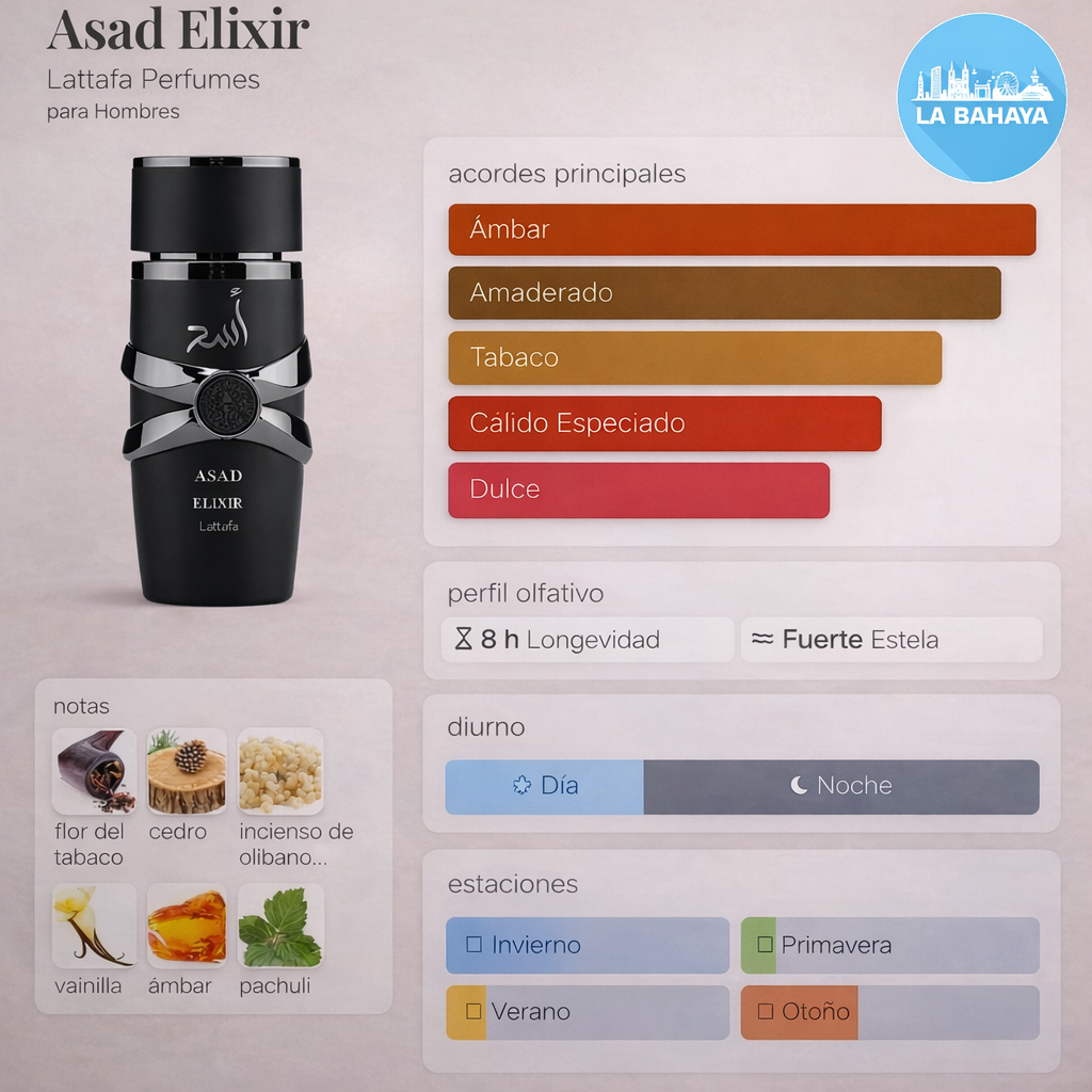 Asad Elixir es una fragancia intensa, oscura y muy seductora, pensada para quienes buscan presencia fuerte y masculina. Tiene un carácter especiado-amaderado con dulzura profunda, ideal para la noche y climas frescos. Proyecta seguridad, elegancia y poder desde la primera atomización, con una estela marcada y larga duración.