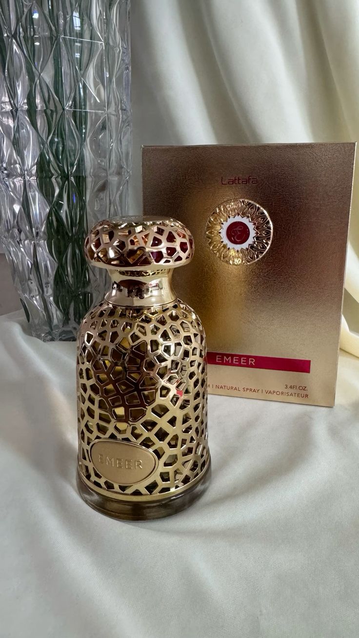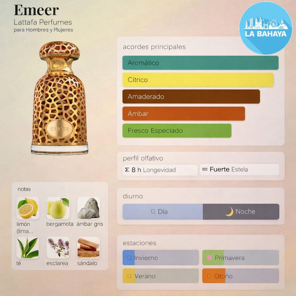 Lattafa Emeer es una fragancia lujosa, cálida y sofisticada, de estilo oriental moderno. Destaca por su mezcla dulce-especiada con fondo amaderado, muy envolvente y elegante. Es un perfume que transmite riqueza, presencia y exclusividad, ideal para quienes aman aromas intensos y refinados.