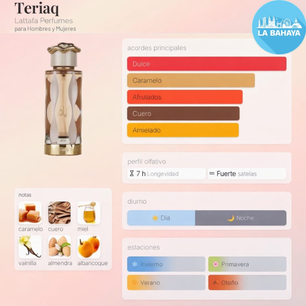 Teriaq es un perfume oriental dulce y especiado, elegante y envolvente. Tiene un aura cálida, sensual y ligeramente misteriosa, ideal para quienes aman los aromas intensos pero refinados. Es un perfume que abraza, deja huella y se siente lujoso desde la primera aplicación. Perfecto para la noche, ocasiones especiales o cuando quieres destacar sin decir una palabra.