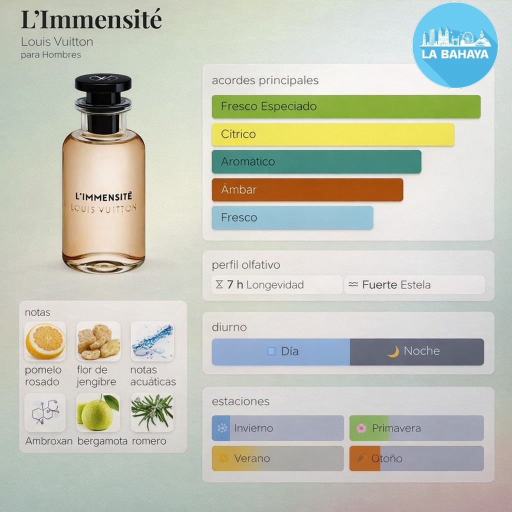 L’Immensité es una fragancia masculina fresca, elegante y sofisticada, con un carácter moderno y limpio. Representa la sensación de libertad y amplitud, combinando cítricos vibrantes con un fondo ambarado y ligeramente especiado. Es refinada, muy versátil y con una estela elegante que no invade, pero sí se nota.