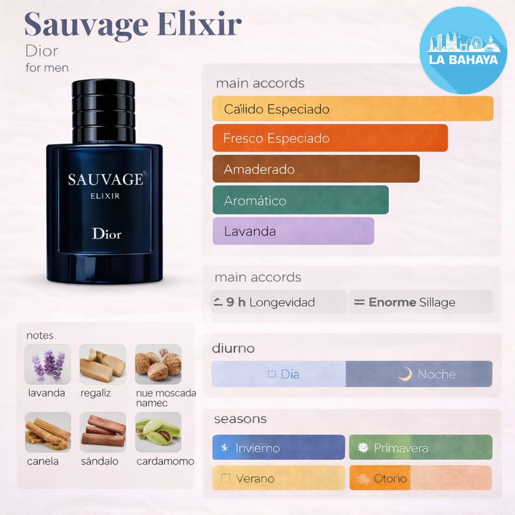 Sauvage Elixir es un perfume poderoso, especiado y profundamente masculino, con un aire elegante y dominante.